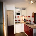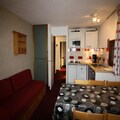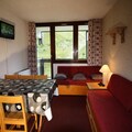 The apartment itself is thoughtfully designed to accommodate up to six guests across its 40m² layout. The south-facing balcony invites you to soak up the sun and alpine air, while the renovated kitchen ensures a modern touch to your mountain escape. The living area features two single beds, a dining space, and a flat-screen TV for relaxed evenings. Two bedrooms provide restful retreats: one with a double bed and another with bunk beds, ideal for families or groups of friends. A well-equipped kitchenette with electric hobs, an oven, a refrigerator, and a dishwasher makes meal preparation a breeze. The bathroom includes a bathtub and sink, with a separate toilet for added convenience.
