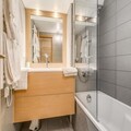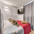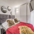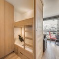 Completely renovated, the 26m² studio is thoughtfully designed to accommodate up to four guests. The living area features a cozy sofa bed, a flat-screen TV, and a large bay window that floods the space with natural light. The modern kitchen is equipped with ceramic hobs, a refrigerator, a combination microwave oven, a dishwasher, and even a washing machine, making it perfect for longer stays. A separate sleeping area with bunk beds ensures privacy and comfort, while the sleek bathroom with a bathtub and separate toilet adds a touch of luxury. Hotel services, including bed linen, towels, and end-of-stay cleaning, ensure a seamless and relaxing experience.