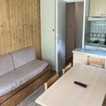 Inside, this classic two-room apartment comfortably accommodates up to six guests across 40 square meters. The layout includes a welcoming entrance hall with storage, a small bedroom with bunk beds, and a second bedroom with a double bed. The living area features two single beds, a dining space, and a kitchenette equipped with essential appliances such as a refrigerator, oven, and dishwasher. After a day on the slopes, unwind in the cozy living room with its flat-screen TV or step out onto the south-facing balcony to soak in the alpine views. The apartment also includes a bathroom with a bathtub and a separate toilet for added convenience.
