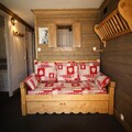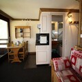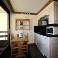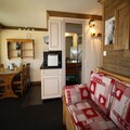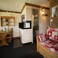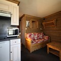 The studio, located on the 8th floor of this well-appointed residence, comfortably accommodates up to four guests. It features a practical layout with a mountain corner equipped with bunk beds, a living area with a trundle bed and TV, and a fully equipped kitchen with modern appliances including a microwave, dishwasher, and ceramic hobs. The bathroom is fitted with a bathtub and sink, while a separate toilet ensures added convenience. Thoughtful touches like duvets on all beds and a private ski locker enhance your stay, while additional services such as Wi-Fi and baby equipment can be arranged for a seamless experience.