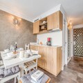 Step inside this thoughtfully designed 26m² space, where modern comfort meets alpine charm. The studio accommodates up to four guests, featuring a cozy sleeping alcove with bunk beds and a living room with a comfortable sofa bed. The open-plan kitchen is fully equipped with a stovetop, refrigerator, microwave, dishwasher, and kettle, making it easy to prepare meals after a day on the slopes. The large bay window floods the space with natural light, creating a warm and inviting atmosphere. Additional amenities include a walk-in shower, separate toilet, and ample storage space for your convenience.