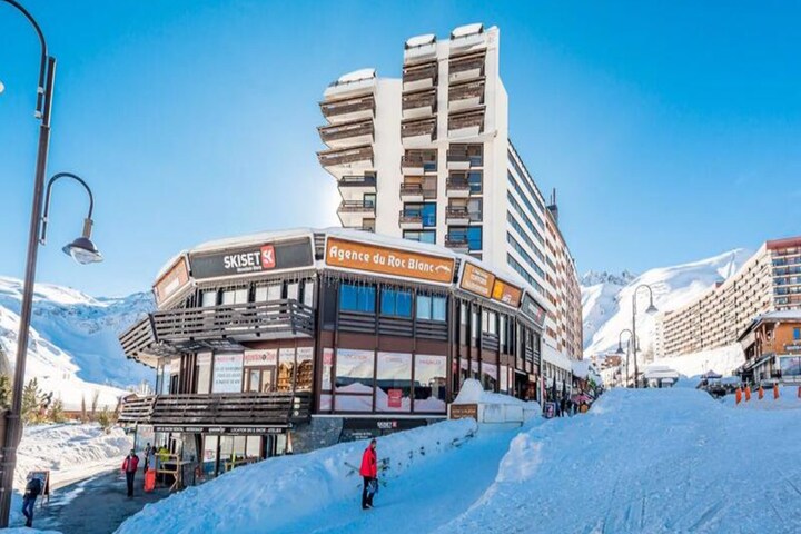 High above the shimmering waters of Tignes Le Lac, this charming studio offers a cozy alpine retreat at an altitude of 2,100 meters. Imagine waking up to breathtaking views of the lake from your private balcony, stepping out into crisp mountain air, and enjoying ski-in/ski-out access to world-class slopes. Whether you're here to carve through powdery pistes or simply soak in the serene beauty of the French Alps, this residence is perfectly positioned to make your holiday unforgettable. \n\nLocated on the third floor of the Residence LE PALAFOUR, this renovated studio comfortably accommodates up to four guests. The cleverly designed layout includes two bunk beds in the entrance and a sofa bed in the living room, ensuring a restful stay for families or small groups. The kitchenette is equipped with modern appliances, including induction hobs, a refrigerator, microwave, and dishwasher, making it easy to prepare hearty meals after a day of adventure. The bathroom features a bathtub, sink, and toilet, while duvets on all beds add a touch of warmth and comfort. \n\nStep outside and discover the vibrant heart of Tignes Le Lac. The residence boasts direct access to ski slopes and is just 50 meters from the LE LAGON water park and 100 meters from the TIGNESPACE sports and cultural complex. A shopping mall within the building offers ski schools, sports shops, a supermarket, bakery, bars, and restaurants, ensuring everything you need is at your fingertips. \n\nWhether you're seeking thrilling winter sports, summer alpine adventures, or simply a tranquil escape surrounded by nature, this studio provides the perfect base for exploring the wonders of Tignes. Let the majestic peaks and sparkling lake inspire your next unforgettable getaway.