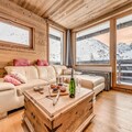 Inside, this premium three-room apartment on the 6th floor has been thoughtfully renovated to blend modern comfort with alpine warmth. The light wood interiors create a cozy yet sophisticated ambiance, perfect for families or groups of up to five. The dual-aspect design floods the space with natural light, while two balconies provide panoramic views of the surrounding peaks. The apartment features a spacious living room with a flat-screen TV, a fully equipped kitchen with high-end appliances, and two inviting bedrooms—one with a double bed and balcony access, and another with bunk beds and a single bed. A sleek bathroom with a bathtub and heated towel rail, along with a separate toilet, completes the layout.