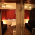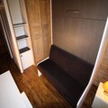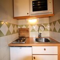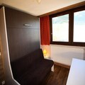 The studio, located on the fifth floor of an 11-story residence with four elevators, is thoughtfully designed to maximize comfort in its 16m² space. It features a large fold-down bed, a TV, and a well-equipped kitchenette with two electric hotplates, a refrigerator, and an oven. The bathroom includes a shower, sink, and toilet, ensuring all essentials are at your fingertips. North-facing and intimate, this apartment is a snug haven after a day of alpine exploration. Private ski lockers add convenience, while the option to rent Wi-Fi and other amenities ensures a tailored stay.