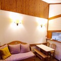 Inside, the studio is thoughtfully designed to maximize comfort and functionality. The living area features a pull-out sofa bed, a dining space, and a TV with fiber optic cable, including Netflix and Amazon Prime, perfect for unwinding after an active day. The separate kitchen is fully equipped with modern appliances, including a refrigerator, dishwasher, ceramic hobs, and a combination oven/microwave, making it easy to prepare hearty meals. A cozy cabin with bunk beds and a bathroom with a heated towel rail add to the apartment’s charm, while the entrance hall provides convenient storage for ski gear.