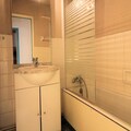 Inside, the spacious 34m² studio is thoughtfully designed to accommodate up to four guests. The living area features a cozy trundle bed, a queen-size fold-down bed, and a comfortable lounge with a TV, perfect for unwinding after a day of adventure. The open-plan kitchen is fully equipped with modern appliances, including ceramic hobs, a refrigerator, a microwave, an oven, and a dishwasher, making it easy to prepare meals to enjoy at the dining table. The bathroom boasts a relaxing bathtub, and a separate toilet adds convenience to your stay.