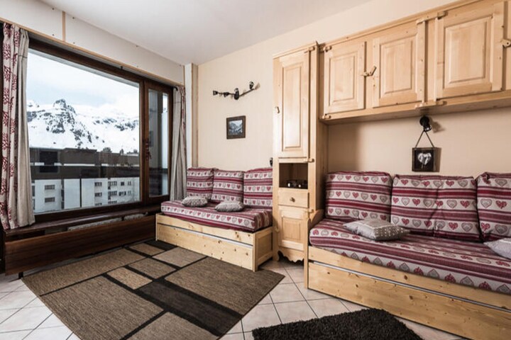In the heart of Tignes le Lac, where alpine charm meets vibrant energy, Le Bec Rouge residence invites you to experience the ultimate mountain getaway. With its prime location at the foot of the slopes, this cozy studio offers seamless access to skiing adventures and ski school meeting points, making it a perfect choice for both beginners and seasoned enthusiasts. Imagine waking up to the sunlit beauty of the southeast-facing balcony, breathing in crisp mountain air, and stepping directly into the snowy wonderland that surrounds you. \n\nDesigned for up to four guests, the 28m² studio is thoughtfully equipped to ensure comfort and convenience. The living area features two trundle beds and a television, creating a welcoming space to relax after a day on the slopes. The kitchen, complete with a ceramic hob, oven, and microwave, is ideal for preparing hearty meals to fuel your alpine adventures. A modern shower room with WC adds to the practicality of this charming retreat, while the ski locker on the ground floor ensures your gear is always ready for action.\n\nLe Bec Rouge’s location places you within walking distance of essential amenities, including ski shops, bars, restaurants, and a supermarket. Whether you’re exploring the slopes in winter or enjoying the dynamic activities offered by the My Tignes card in summer, the residence serves as a gateway to unforgettable experiences. From panoramic views of the surrounding peaks to the lively atmosphere of Tignes le Lac, every moment here is infused with the magic of the mountains.\n\nChoose Le Bec Rouge for your next alpine escape and discover the perfect blend of adventure, comfort, and breathtaking scenery. Whether you’re carving through fresh powder or soaking up the summer sun, this residence promises memories to last a lifetime.