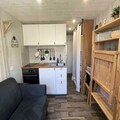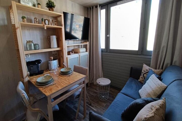 High above the shimmering waters of Tignes Le Lac, this stylish studio apartment invites you to experience the magic of the French Alps in every season. Whether you're drawn to the thrill of skiing down pristine slopes or the serenity of alpine summer adventures, this residence places you at the heart of it all. From its 11th-floor vantage point, the apartment offers a cozy retreat for couples seeking both comfort and convenience in one of the most iconic mountain destinations in Europe. \n\nTastefully renovated and thoughtfully designed, the 12m² studio is equipped with everything you need for a relaxing stay. The living room features a comfortable sofa bed for two, while the compact yet functional kitchen includes an induction hob, refrigerator, and oven—perfect for preparing meals after a day of exploration. The entrance hall provides ample storage, and the modern shower room ensures a refreshing start or end to your day. A ski locker on the ground floor adds practicality for winter guests, making your alpine adventures seamless. \n\nStep outside and find yourself at the foot of the ski slopes, with ski school departure points just moments away. In winter, enjoy preferential rates on Tignes and Val d'Isère lift passes, while summer brings the My Tignes card, unlocking a world of activities from hiking to mountain biking. The vibrant village atmosphere of Tignes Le Lac offers shops, restaurants, and even a swimming pool, ensuring entertainment and relaxation are always within reach. \n\nWhether you're chasing powdery descents or basking in the alpine sun, this charming studio is your gateway to unforgettable memories in the French Alps. With its unbeatable location and cozy ambiance, it’s the perfect choice for couples looking to immerse themselves in the beauty and excitement of Tignes.