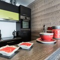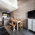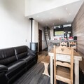 Inside, the recently renovated 75m² apartment spans two levels, combining modern comfort with alpine charm. Accommodating up to eight guests, it features three cozy bedrooms, including a mezzanine with a double bed and another with twin mattresses. The master bedroom boasts an en-suite shower room for added privacy. The open-plan kitchen is fully equipped with an induction hob, oven, microwave, and dishwasher, making it easy to prepare hearty meals after a day on the slopes. A spacious living and dining area invites you to unwind in style, while amenities like Wi-Fi and a washing machine ensure a hassle-free stay.