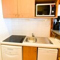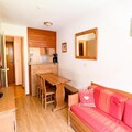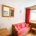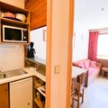 Inside, the apartment is thoughtfully designed to accommodate up to six guests. The cozy living room features a trundle bed and a TV for relaxed evenings, while the fully equipped kitchen with ceramic hob, microwave, and dishwasher makes meal preparation a breeze. A double bedroom and a nook with bunk beds provide comfortable sleeping arrangements for all. The south-facing balcony is perfect for soaking in the sun or enjoying a quiet moment with panoramic views. Additional amenities include a ski locker on the ground floor, elevator access, and the option to bring pets for a small fee.