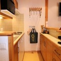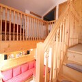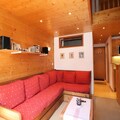 Inside, the apartment spans two levels and is thoughtfully designed to accommodate up to six guests. The ground floor features a cozy living room with plush sofas, a television, and a stereo system, creating a welcoming space to unwind after a day on the slopes. The open kitchen is fully equipped with modern appliances, including a dishwasher, microwave, and a Krups coffee machine, making it easy to prepare hearty meals. A cabin bedroom with bunk beds, a bathroom, and a separate toilet complete the lower level. Upstairs, you’ll find a tranquil double bedroom, an alcove with a trundle bed, and an additional shower room with a toilet, ensuring comfort and privacy for all.