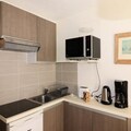 Equipped kitchen with ceramic hob, microwave, and extractor fan