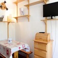 Step into this charming 15m² studio, thoughtfully designed to accommodate two guests. Located on the third floor with elevator access, the west-facing balcony invites you to unwind with views of the surrounding peaks. The living space features a bunk bed, a dining area, and a television for cozy evenings in. The kitchenette is equipped with essentials, including an electric hob, refrigerator, and microwave, ensuring you have everything needed for a comfortable stay. A private shower room and toilet complete the space, while a ski locker on the ground floor keeps your gear secure and ready for adventure.