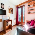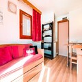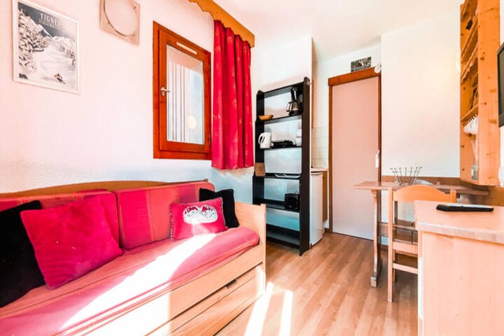 High above the shimmering slopes of Tignes, this charming studio apartment offers a cozy retreat for couples or solo travelers seeking an unforgettable alpine getaway. With its west-facing balcony, you can soak in the breathtaking mountain views as the sun sets over the peaks, creating a magical atmosphere that perfectly complements your days of adventure. Whether you're here for skiing, snowboarding, or simply to revel in the beauty of the French Alps, this residence situates you at the heart of it all. \n\nThe 17m² studio is thoughtfully designed to maximize comfort and functionality. Located on the 5th floor of a building with an elevator, it features a pull-out sofa bed in the living room and a set of bunk beds in the entrance hall, separated by a sliding door for added privacy. The fully equipped kitchen includes a ceramic hob, microwave, kettle, coffee maker, and refrigerator, ensuring you have everything needed to prepare hearty meals after a day on the slopes. A modern bathroom with a shower and toilet adds to the convenience, while a television and ski locker enhance your stay.\n\nSituated in the Val Claret Bas area, the residence is just 100 meters from the village center, offering easy access to ski lifts, the funicular, and a variety of shops. Whether you need to rent equipment, grab a quick bite, or explore local attractions, everything is within walking distance. Parking is available in the resort for a fee, making it simple to arrive and settle in.\n\nThis delightful studio is perfect for those who value comfort, location, and stunning alpine views. From thrilling days on the slopes to peaceful evenings watching the sunset, your stay here promises to be as memorable as the mountains themselves.