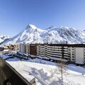 High above the shimmering waters of Tignes le Lac, this charming ski-in/ski-out apartment offers a perfect alpine retreat for families and friends. With breathtaking views of the Tufs, the Grande Motte glacier, and the serene lake below, every moment here is framed by the majestic beauty of the French Alps. Whether you're waking up to the soft glow of sunrise over the peaks or relaxing on the balcony after a day on the slopes, this property promises an unforgettable mountain escape. \n\nInside, the apartment is thoughtfully designed to accommodate up to eight guests, making it ideal for families or groups. The layout includes a cozy double bedroom with an en-suite shower room, a bunk bedroom perfect for children, and a comfortable living area with a sofa bed. The open-plan kitchen is fully equipped, allowing you to prepare hearty meals to enjoy in the inviting dining area. Modern amenities such as Wi-Fi, fresh linens, and beds made upon arrival ensure a seamless and relaxing stay. \n\nSituated in the heart of Tignes le Lac, the Bec Rouge residence places you just steps away from the slopes and the vibrant village center. Ski lifts, shops, and restaurants are all within easy reach, making it effortless to transition from thrilling alpine adventures to cozy evenings by the fire. In summer, the area transforms into a haven for hikers, bikers, and nature enthusiasts, with the lake offering opportunities for paddleboarding and picnics. \n\nWhether you're here to carve through pristine snow or bask in the summer sun, this apartment is your gateway to the best of Tignes. Let the crisp mountain air and stunning landscapes set the stage for cherished memories with loved ones.