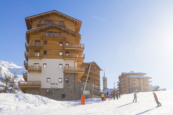 Résidence L 'Altaviva consists of several connected large, new chalets in the hamlet of Tignes 1800 (formerly' Les Boisses'). It is located on the slopes and the ski lift 'Boisses' is around the corner (just pop on your skis, and you're right there). Shops, bars, restaurants, a ski equipment shop and the tourist office are all in the direct vicinity. The indoor swimming pool (free entrance), sauna, steam bath, jacuzzi and fitness room are accommodated in the well-kept Spa (1 to 3 x free entrance, depending on the type of apartment). There is also a beautiful reception/lounge (sandwich service), lifts, parking garage, luggage room and ski storage space.