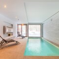 Ground floor: Kitchen(electric kettle, coffee machine, combination microwave, fridge, freezer), bedroom(double sofa bed, bunk bed, bunk bed, bunk bed, bunk bed), Bedroom with bathroom(double bed(160 x 190 cm), Bubble bath, toilet), sanitary facility(shower, shower, washbasin, toilet), sauna(private), Turkish steambath, Bubble bath, ski storage, garden doors, terrace, swimming pool(private, heated, indoor, 7 x 3 m.)