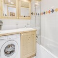 The apartment features a fully equipped kitchen with modern appliances such as a dishwasher, oven, and microwave, making it easy to prepare meals. The bathroom is well-equipped with a hairdryer and washing machine, while the separate toilet adds convenience. The large sunny balcony offers a perfect spot to relax after a day of exploring the area.
