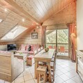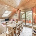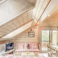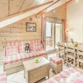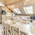 The apartment comes equipped with a fully functional kitchen, open to the living and dining area. The space also features a TV, large south-facing balcony, and Velux windows in the roof, providing plenty of natural light and stunning views. Additional amenities include a ski locker, covered parking, and access to on-site facilities such as the swimming pool, gym, and spa (open seasonally).