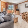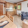 The apartment features an open-plan kitchen equipped with everything you need to prepare meals, including a stove, microwave, and refrigerator. The living area includes a dining space and a TV, perfect for relaxing after a day on the slopes. Guests can also unwind on the sunny south-facing balcony. Additional amenities include access to a swimming pool, gym, and a spa (during winter season), with the option of booking massages for extra relaxation.