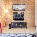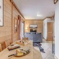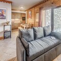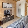 The apartment features a fully equipped kitchen open to the living room, complete with modern appliances. A large east-facing terrace provides a sunny spot to relax and take in the beautiful surroundings. Additional amenities include a ski locker, free covered parking, and access to a swimming pool, gym, and spa (seasonal).