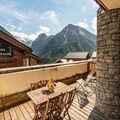 The apartment features a fully equipped kitchen with a refrigerator, oven, stove, and dishwasher, making meal preparation simple. It also includes a bathroom with a bathtub, a washing machine, and a separate toilet. The south-facing terrace offers a peaceful spot to relax and take in the views of the Vanoise Massif.