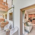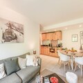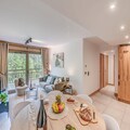 The 72 m² first-floor apartment features a 24 m² south-facing balcony with furnished, unobstructed views. Inside, the fully equipped kitchen includes an oven, microwave, induction hob, refrigerator, and dishwasher. A cozy living space with a sofa, TV, dining area, and a washing machine ensures a comfortable stay.
