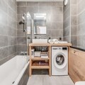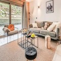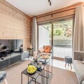 The apartment features a fully equipped kitchen with an induction hob, refrigerator with freezer, and dishwasher, making it easy to prepare meals. The bathroom includes a bathtub, towel radiator, vanity unit, and a washing machine for added convenience. The living area opens onto a terrace, perfect for enjoying the scenic views of the mountains. Hotel services such as bed linens, towels, and end-of-stay cleaning (excluding the kitchen) are included for your comfort.
