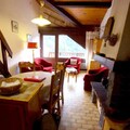 The apartment features a fully equipped kitchen with modern appliances, including a mini oven, microwave, refrigerator, induction hob, and dishwasher. Additional amenities include a bathroom with a bathtub and towel radiator, a ski locker, and private covered parking. A comfortable, homey space that is perfect for a ski getaway.