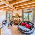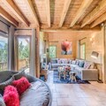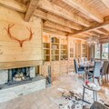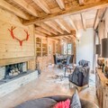 The chalet is equipped with a fully independent kitchen featuring a dishwasher, oven, microwave, and gas hob, as well as a large fridge/freezer and pantry with a washing machine and dryer. The spacious living room includes a fireplace, TV, sound system, and a dining area, offering comfort and entertainment. The chalet also boasts a large balcony/terrace and a wooded garden.