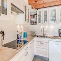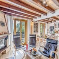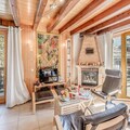 The chalet offers a fully equipped kitchen with modern appliances, including an oven, microwave, fridge with freezer, dishwasher, and electric coffee maker. The spacious living and dining areas are designed for comfort, featuring a fireplace, sofas, and a bay window that leads to the balcony. Additional amenities include a private garage, a laundry room with a washing machine, dryer, and ironing facilities. Free Wi-Fi, baby chair, and bed, as well as linens and towels, are included for your convenience.