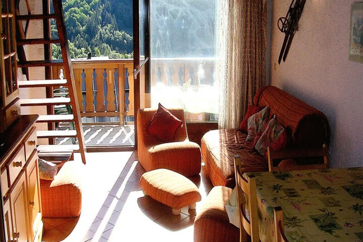 This charming duplex apartment, perfect for up to 6 people, offers a peaceful retreat in the heart of the mountains. The main level features a spacious living area with a dining area, kitchenette, and lounge area with a sofa that can convert into a bed. There are two bedrooms on the upper level, one with a double bed and the other with two bunk beds, a folding bed, and a pull-out bed. The apartment is pet-friendly with a supplement, and it is non-smoking. A balcony provides beautiful views of the Champagny le Haut valley.