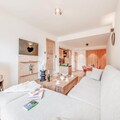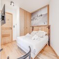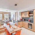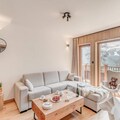This spacious 90m² apartment accommodates up to 8 people, featuring three bedrooms, including a master with an en-suite shower room and two bedrooms with single beds. The cozy living area offers a double sofa bed, armchairs, a TV, and a pellet stove, creating a warm, inviting atmosphere. The apartment has a balcony with a south/east-facing view, allowing plenty of natural light. Pets are not allowed, and smoking is prohibited. A security deposit is required.