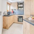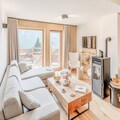 This charming 3-room apartment accommodates up to 6 people and is located on the raised ground floor of a new 4* residence. The apartment features a double bed in the master bedroom, two single beds in the second bedroom, and a sofa bed in the living room. It is a non-smoking property, and pets are not allowed. The residence offers free Wi-Fi, and bed and bathroom linens are provided with made beds upon arrival. A pellet stove adds a cozy touch to the living room, and a covered parking space is available for guests.