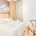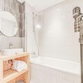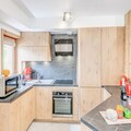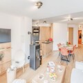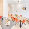 The apartment includes a fully equipped kitchen with modern appliances, such as an oven, microwave, induction hob, refrigerator, and dishwasher. A dining area with a wooden table complements the kitchen. The bathroom and a separate toilet with a washing machine/dryer add convenience. A 6.5m² terrace and a 5.6m² balcony provide a peaceful outdoor space with no overlooking neighbors. End-of-stay cleaning (excluding the kitchen) is included in the rental.