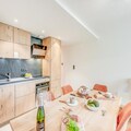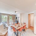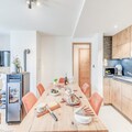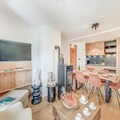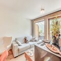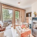 This new, cozy apartment, opening December 2022, accommodates up to six guests. It features two bedrooms with two single beds each and a double sofa bed in the living room. A west-facing balcony offers pleasant views. The residence, with only 14 apartments, includes covered parking, bicycle attachment rings, electric charging, and a ski locker with a shoe warmer. Pets are not allowed, and smoking is prohibited.