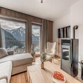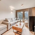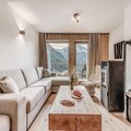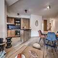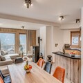 The apartment features a fully equipped kitchen with an oven, microwave, induction hob, fridge, and dishwasher, allowing guests to prepare meals at their leisure. The bathroom includes a shower, and there is a separate toilet with a washing machine and dryer for added convenience. Guests also have access to covered parking, a ski locker, and a bike rack, with an electrical charging socket available for e-bikes. An indoor swimming pool and sauna will be available in December 2023 for added relaxation after a day of outdoor activities.