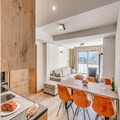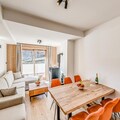 The apartment boasts a fully equipped kitchen with modern appliances, including an oven, microwave, induction hob, refrigerator, and dishwasher. The spacious dining area is perfect for family meals, and the bathroom is equipped with a washer/dryer. Additional amenities include a separate toilet and a private terrace with outdoor furniture for relaxing after a day of adventure.