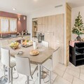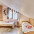 Spanning 160 m² across three levels, the chalet boasts spacious and thoughtfully designed interiors, ideal for families or groups of up to ten guests. The main floor features a cozy living room with a wood-burning stove, a dining area, and a fully equipped kitchen with modern appliances and a central island. Five beautifully appointed bedrooms, including a master suite with a private shower room and dressing area, ensure restful nights. Additional amenities such as a ski storage area with a boot dryer, a garage with two spaces, and three outdoor parking spots enhance the convenience of your stay. The chalet also offers a large bathroom with a bathtub, a baby dressing table, and two travel cots for families with young children.