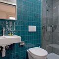 The bathroom is equipped with an elegant shower and WC. The modern tiles and high-quality furnishings give the room a pleasant atmosphere.
