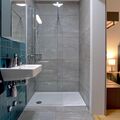 The bathroom is equipped with an elegant shower and WC. The modern tiles and high-quality furnishings give the room a pleasant atmosphere.