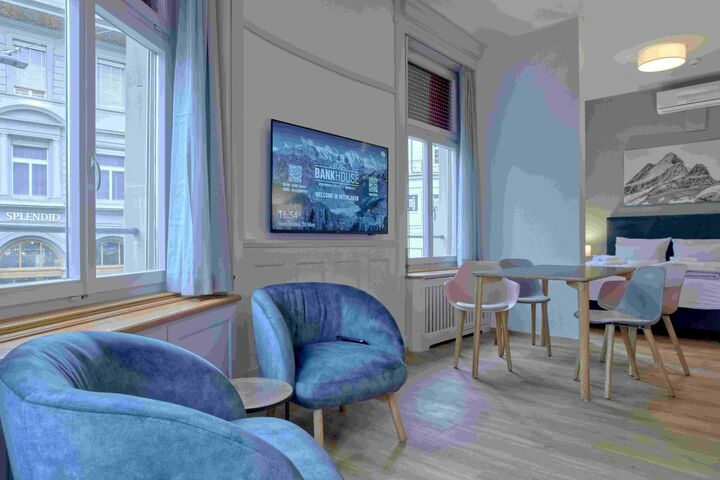 The historic building, once an imposing bank, is located in the heart of the vibrant centre of Interlaken and is just a few steps away from Interlaken West train station. The bus station is just a few metres from the entrance.