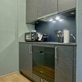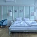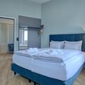 The bedroom is furnished with a comfortable double bed (160cm x 200cm) to ensure a good night's sleep. The soft lighting and coordinated materials create a calm and relaxing atmosphere that is ideal for a restful night's sleep.