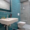 The bathroom is equipped with an elegant shower and WC. The modern tiles and high-quality furnishings give the room a pleasant atmosphere.