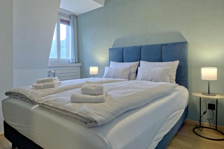 The bedroom is furnished with a comfortable double bed (160cm x 200cm) to ensure a good night's sleep. The soft lighting and coordinated materials create a calm and relaxing atmosphere that is ideal for a restful night's sleep.