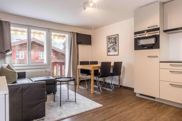 The cozy studio on the ground floor has a bedroom with a double bed and a bathroom with shower/toilet. The well-equipped kitchen opens into a cozy living and dining area. On the balcony you can enjoy the view of the mountains of Grindelwald.