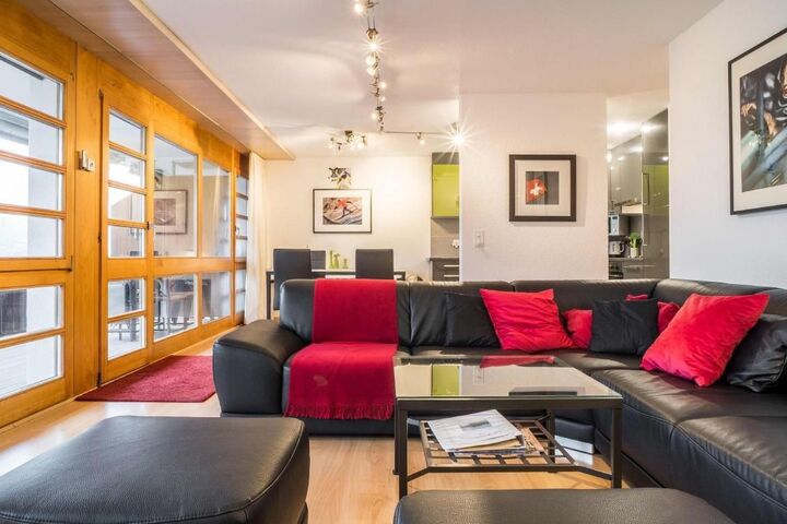 The 90m2 3.5-room apartment on the 2nd floor has a bedroom with double bed, a bedroom with two single beds, a bathroom with shower, toilet and bidet and a bathroom with bath and toilet. The well-equipped kitchen adjacent to the cosy dining/living area. From the balcony you can enjoy the unique mountain panorama.