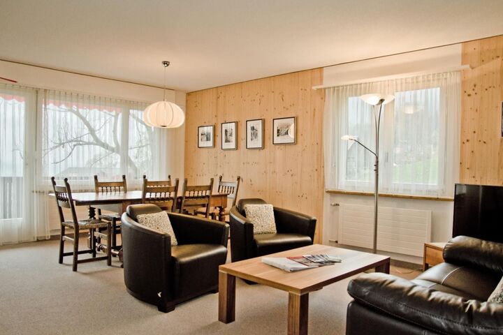 The cosy 70m2 3.5-room apartment on the 1st floor has a bedroom with double bed, a bedroom with two single beds and a bathroom with bath and toilet. The apartment has a well-equipped open kitchen and a comfortable dining/living area. From the large balcony you can enjoy views of the mountains.