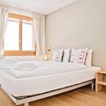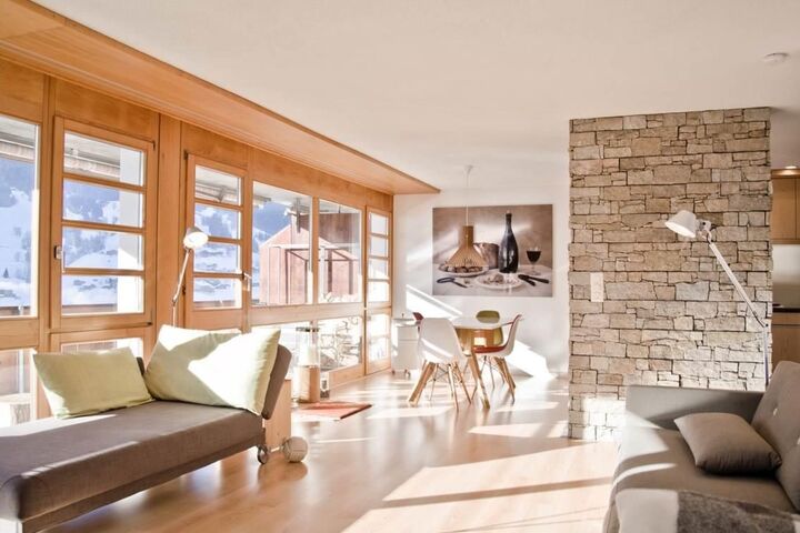 The 86m2 3.5-room apartment on the 3rd floor has a bedroom with double bed, a bedroom with two single beds and a bathroom with shower and toilet. The modern kitchen opens onto the open dining/living area. From the balcony you can enjoy wonderful views of the mountain panorama.