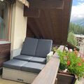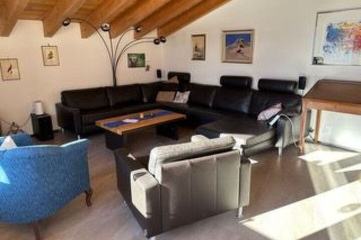 Penthouse flat with a gigantic view of the mountain panorama, tastefully furnished with everything your heart desires. The fireplace creates a cosy atmosphere. The flat was newly renovated in 2016 and 2019 and adapted to current requirements. The location is quiet and yet close to the village centre, bus station reachable in 5min. There are three bedrooms with 2 beds each (1 x 200x200cm bed, 1 x 140x200cm, 1 x 2 beds each 90x200cm with additional sofa bed in the room). There are wall cupboards in all rooms, providing plenty of storage space. The kitchen is equipped with all the necessary utensils. There is additional space for shoes or more in the hallway just outside the front door. The building has a lift, a private parking space outside and a reserved parking space in the garage.